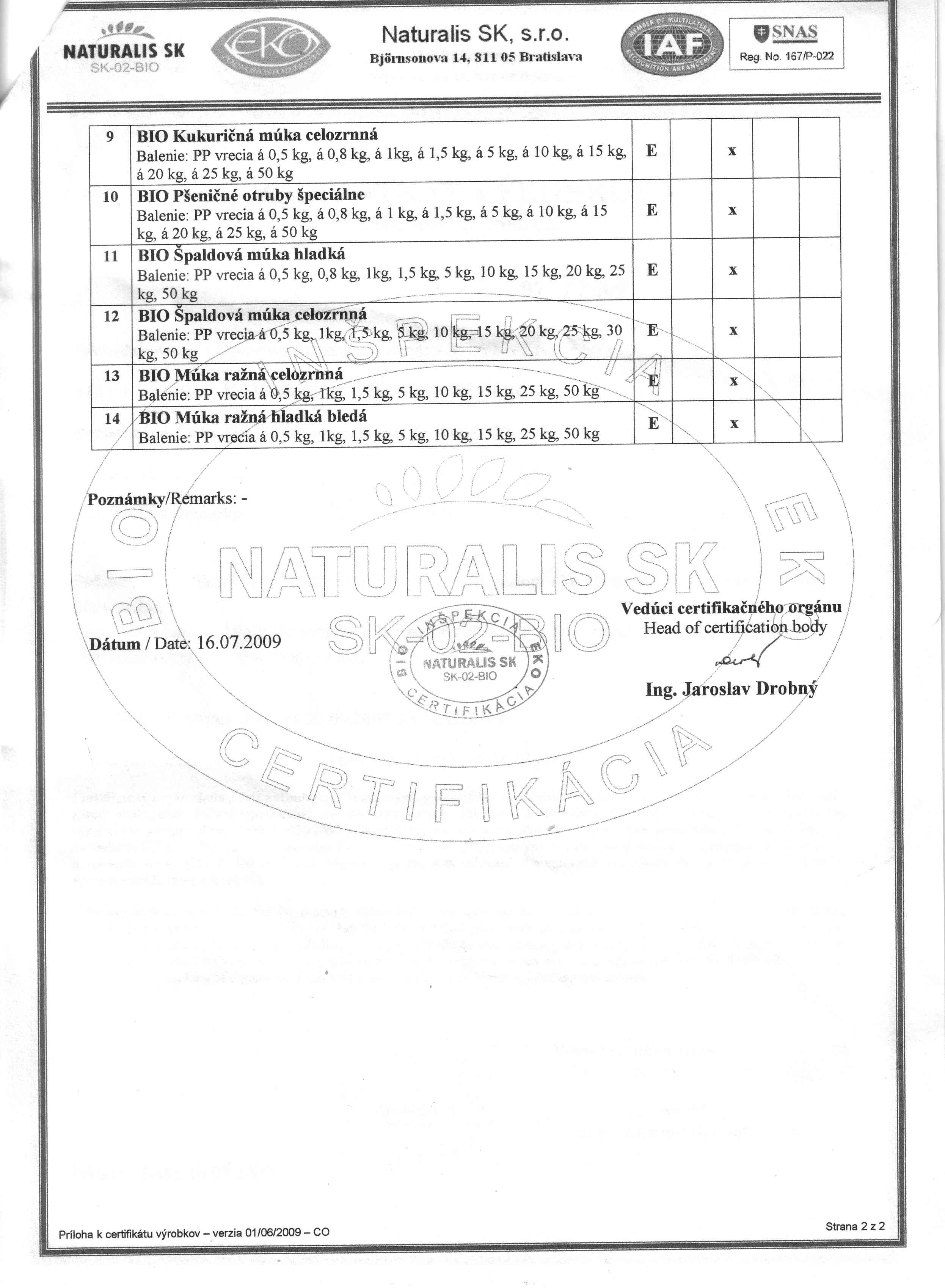 Bio kukuričná múka celozrnná /hladká/: vyrobená z bio kukurice siatej /Zea mays/. Je vhodná na prípravu zásmažiek, halušiek, cestovín ale aj pizze či na pečenie. Prirodzene bezlepková potravina.